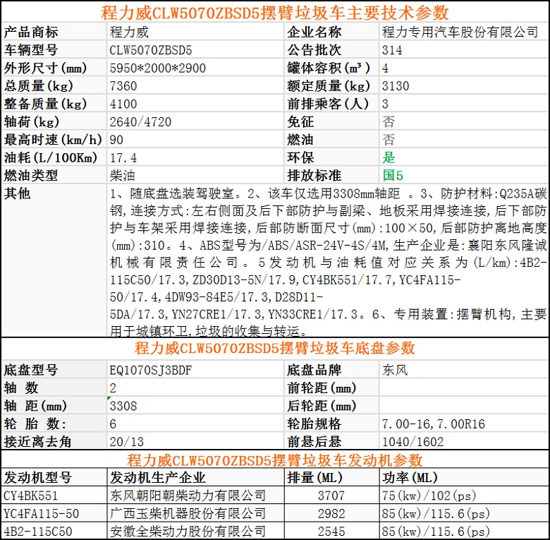采用東風(fēng)原裝底盤,EQ1070SJ3BDF 國五 多利卡D6,脂玉白,軸距3308,1730單排前翻轉(zhuǎn)駕駛室,發(fā)動機國五朝柴 CY4BK551,102馬力;全柴4B2-115C50,115馬力,變速箱5A100(5TS40)萬里揚5擋變速箱,前后橋1.8/3.5T,車架190mm,板簧6/6+5,輪胎7.00R16鋼絲胎,動轉(zhuǎn)、方向助力、氣剎、ABS、空調(diào)。