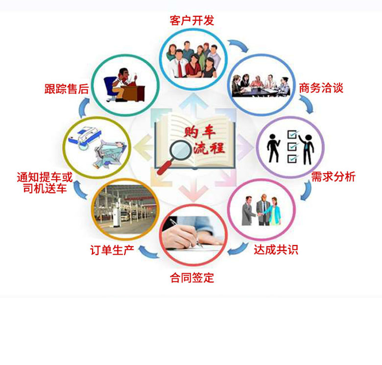 | 2、購車流程: | 1、咨詢洽談(電話洽談或來廠考察洽談) 2、簽訂汽車購銷合同(傳真、郵遞或者來廠簽訂) 3、我廠按時按質(zhì)生產(chǎn) 4、交付驗收 >>點擊查看詳細內(nèi)容 |