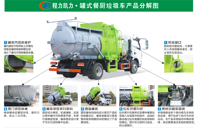 餐廚垃圾車,又稱餐余垃圾車、余廚垃圾車或者泔水車,是用于收集和運(yùn)輸生活垃圾、食品垃圾(泔水)及城市淤泥的專用車輛,改裝部分具有裝、卸垃圾自動(dòng)化程度高、工作可靠、密封性好、裝載容積大、操作簡(jiǎn)便、作業(yè)過程密閉,無污水泄露和異味的散發(fā),環(huán)保性好等特點(diǎn)�?膳溲b載不同規(guī)格的標(biāo)準(zhǔn)垃圾桶,具有廣泛的適用性。