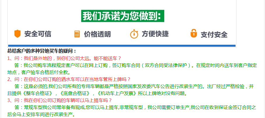 | 2、購車流程: | 1、咨詢洽談(電話洽談或來廠考察洽談) 2、簽訂汽車購銷合同(傳真、郵遞或者來廠簽訂) 3、我廠按時按質(zhì)生產(chǎn) 4、交付驗收 >>點擊查看詳細內(nèi)容 |