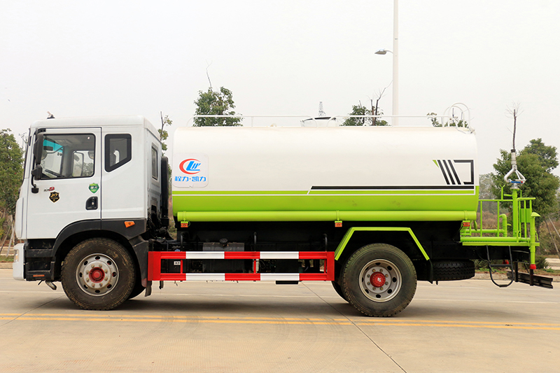 前噴后灑,前裝有鴨形噴嘴或圓頭沖嘴,后面裝有圓柱開灑水噴嘴或蓮蓬頭噴嘴,后部有一工作平臺,裝配有高壓水炮。后部還可裝8個噴嘴(選裝)噴水器一般用于沖洗街道。