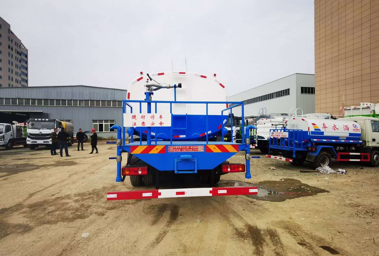 前噴后灑,前裝有鴨形噴嘴或圓頭沖嘴,后面裝有圓柱開(kāi)灑水噴嘴或蓮蓬頭噴嘴,后部有一工作平臺(tái),裝配有高壓水炮。后部還可裝8個(gè)噴嘴(選裝)噴水器一般用于沖洗街道。