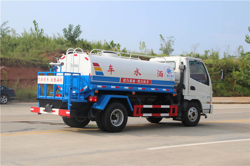 前噴后灑,前裝有鴨形噴嘴或圓頭沖嘴,后面裝有圓柱開灑水噴嘴或蓮蓬頭噴嘴,后部有一工作平臺,裝配有高壓水炮。后部還可裝8個噴嘴(選裝)噴水器一般用于沖洗街道
